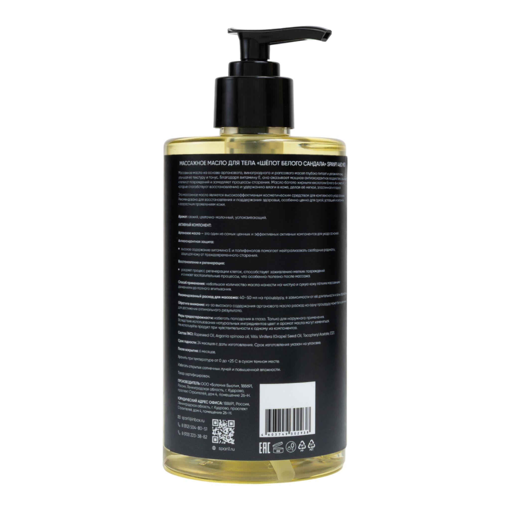 Массажное масло на основе арганового и виноградного, рапсового масла глубоко питает и увлажняет кожу, улучшая её текстуру и тонус. Благодаря витамину Е, оно оказывает мощное антиоксидантное действие, защищая клетки от повреждений и замедляя процессы старения. Масло богато жирными кислотами (омега-6 и омега-9), которые способствуют восстановлению и удержанию влаги в коже, делая её мягкой, эластичной и гладкой.